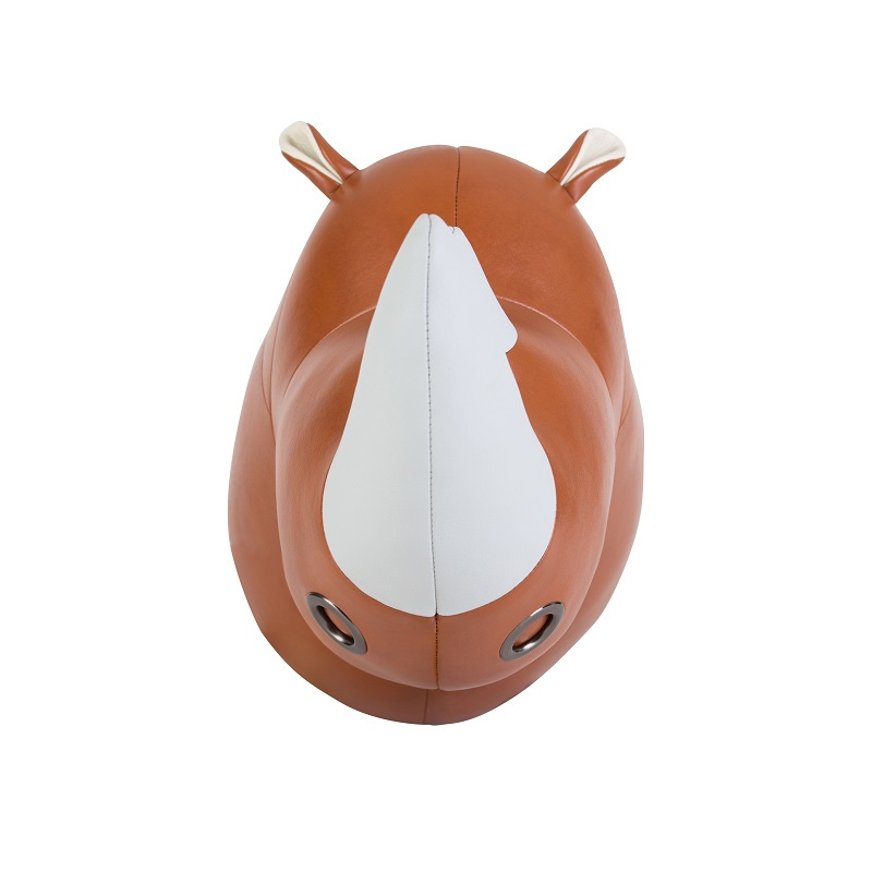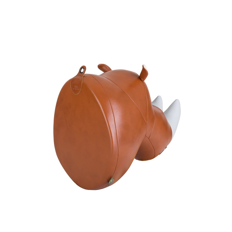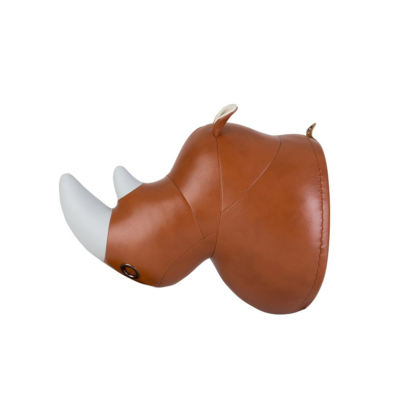 Rinoceros Wandtrofee van hoogwaardig kunstleer, vervaardigd in ambachtelijke naai-ateliers in Taiwan, elk exemplaar handgemaakt. Kan opgehangen worden aan kort lusje bovenop.