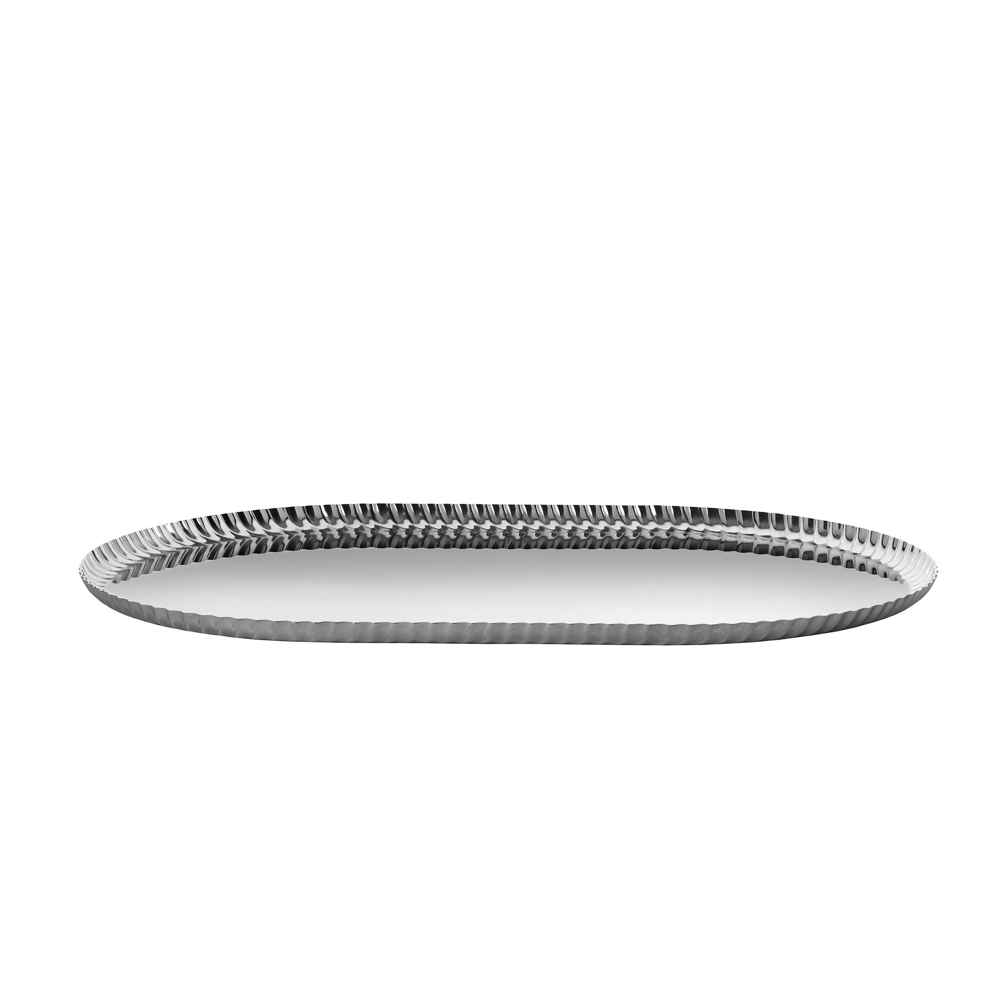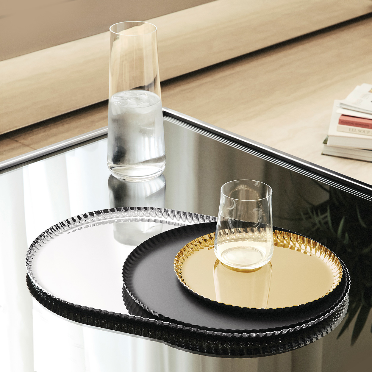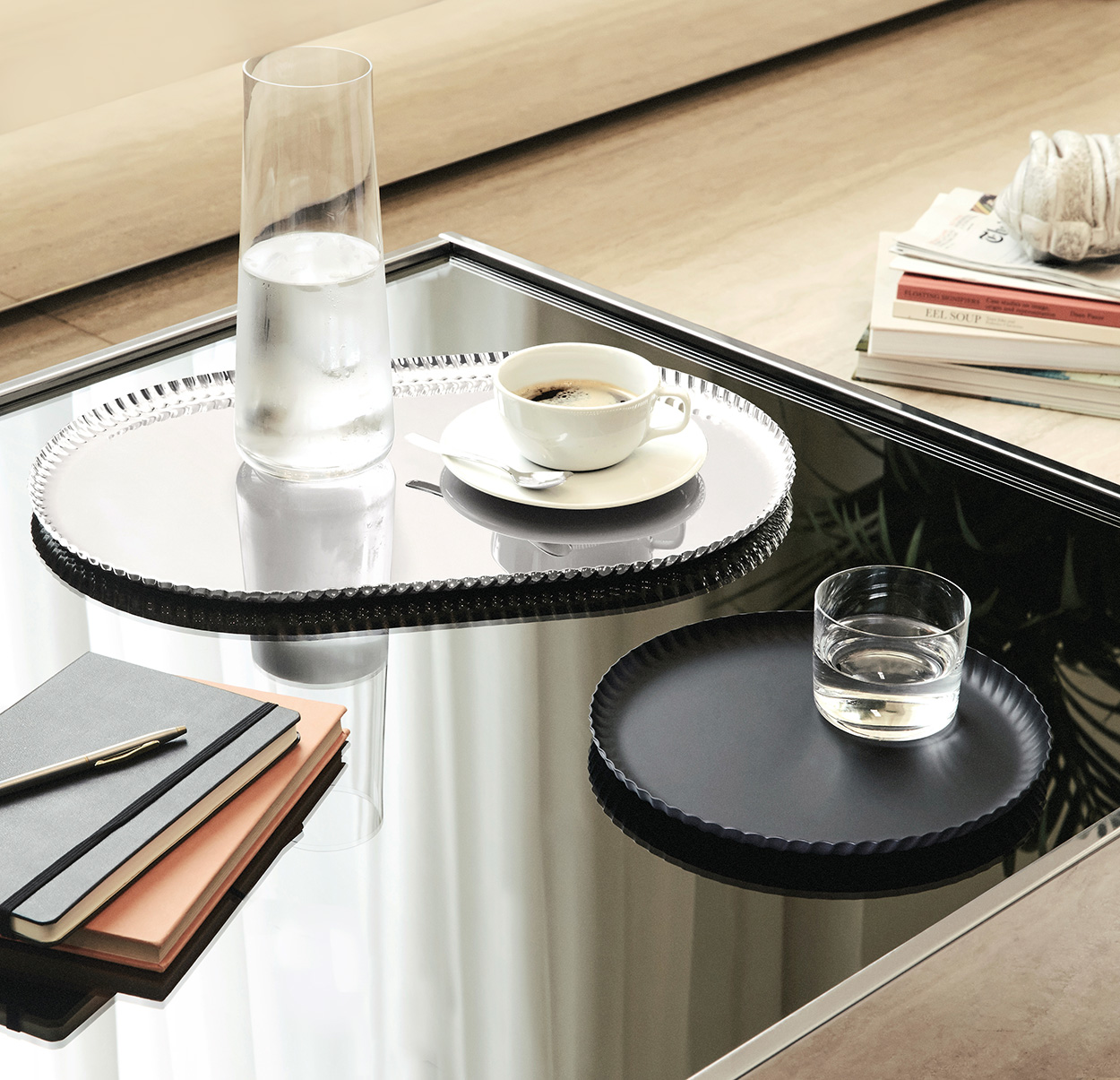 De Pleats-serie vertaalt de natuurlijke eigenschappen van metaal in vorm. De geplooide rand, die doet denken aan een kroonkurk, ontstaat vanzelf uit het bewerken van het materiaal – een moderne verwijzing naar oude technieken van hamerslagen op metaal (metaalstuiken/repoussé/planeren). Ontwerper Jin Kuramoto heeft dat ‘onvermijdelijke’ proces verfijnd tot een subtiel ontwerp-element.