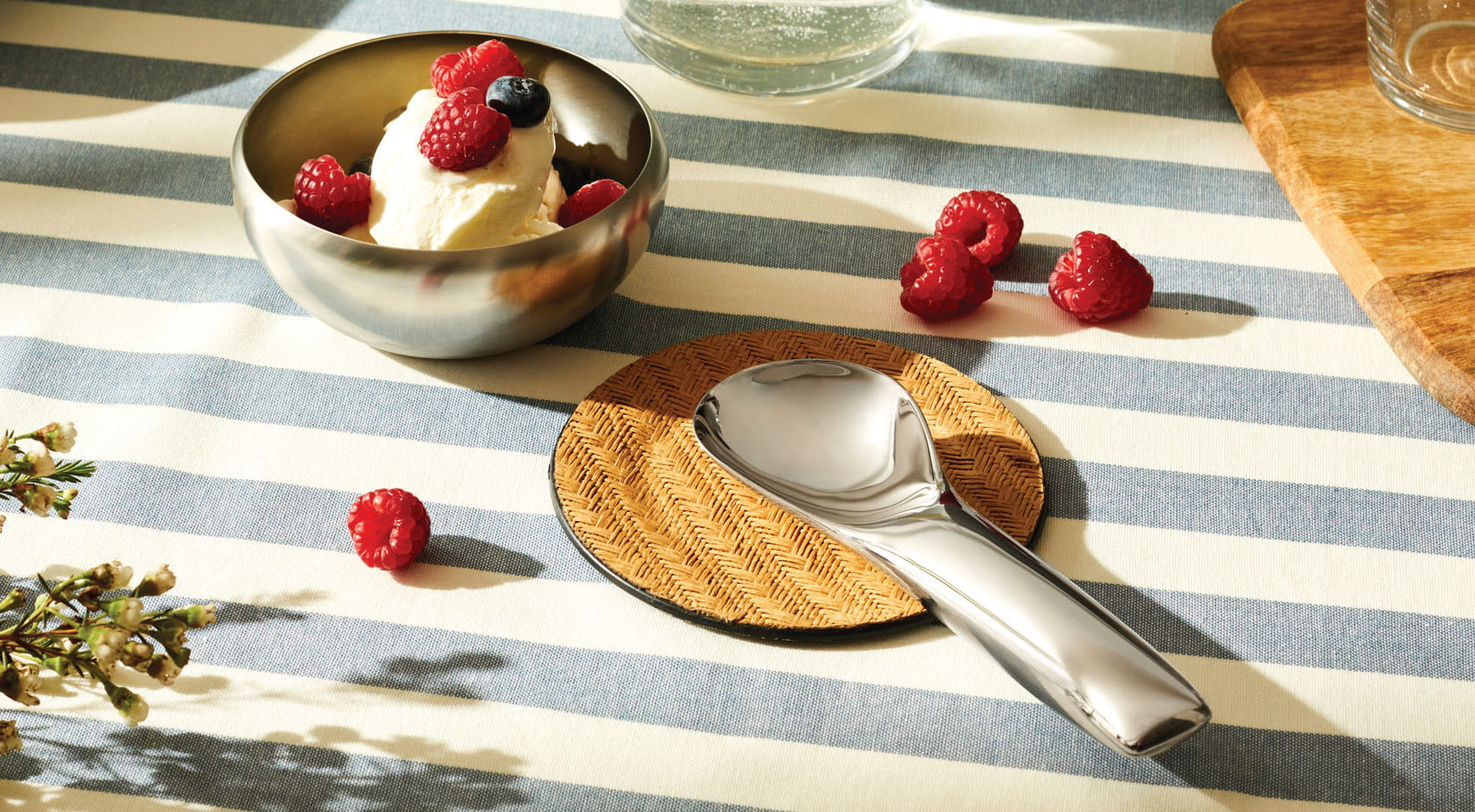 Twee ijscoupes, ijslepels en ijsschep