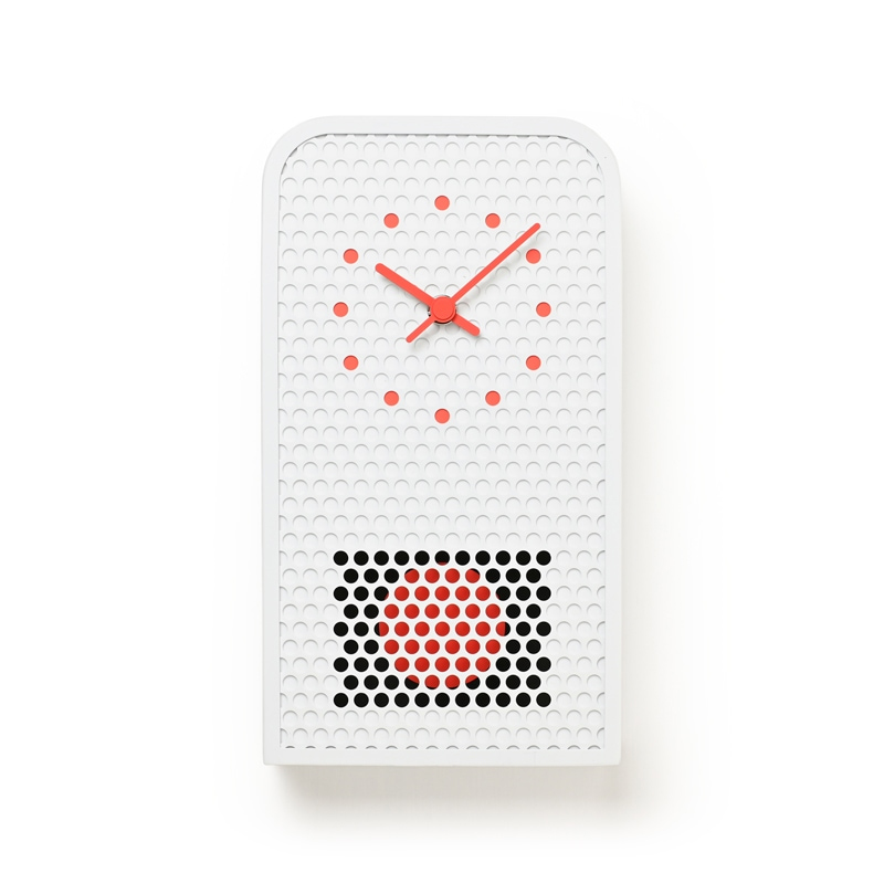 MOOV is een metalen slingerklok uit Japan, gemaakt van geperforeerd metaal. De open structuur laat de slinger subtiel door de perforaties zien, wat een moderne twist geeft aan het klassieke slingermechanisme. De wijzers zijn afgestemd op het patroon van de perforaties voor een strak, geïntegreerd geheel.