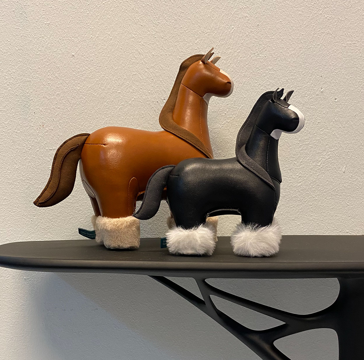 Compact Shire-paard als presse-papier, met zwarte manen, een elegante zwarte staart, witte moffen en een subtiele witte vlek op de neus. Zwaar genoeg om papieren op hun plek te houden, maar zacht aan de buitenkant dankzij het vegan kunstleer waar Zuny om bekend staat. De Zuny dierfiguren worden gemaakt in ambachtelijke ateliers, waarbij vooral de fraaie belijning van de stiksels de kenmerken van de dieren uitbeelden. Verzwaard met stalen kogeltjes.