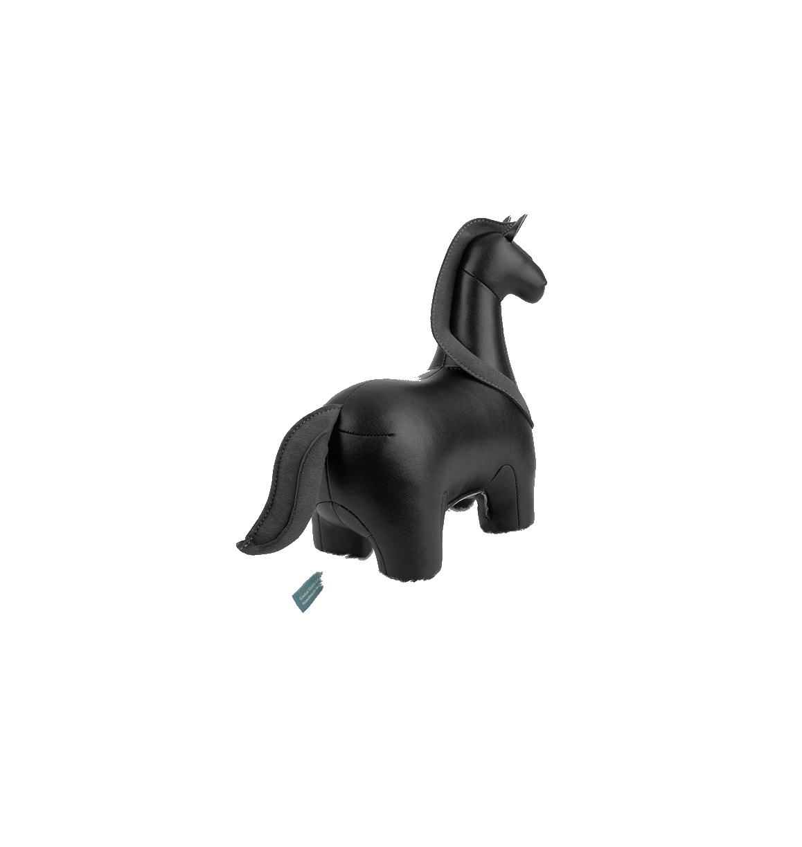 Compact Shire-paard als boekensteun, met zwarte manen, een elegante zwarte staart, witte moffen en een subtiele witte vlek op de neus. Zwaar genoeg om papieren op hun plek te houden, maar zacht aan de buitenkant dankzij het vegan kunstleer waar Zuny om bekend staat. De Zuny dierfiguren worden gemaakt in ambachtelijke ateliers, waarbij vooral de fraaie belijning van de stiksels de kenmerken van de dieren uitbeelden. Verzwaard met stalen kogeltjes.