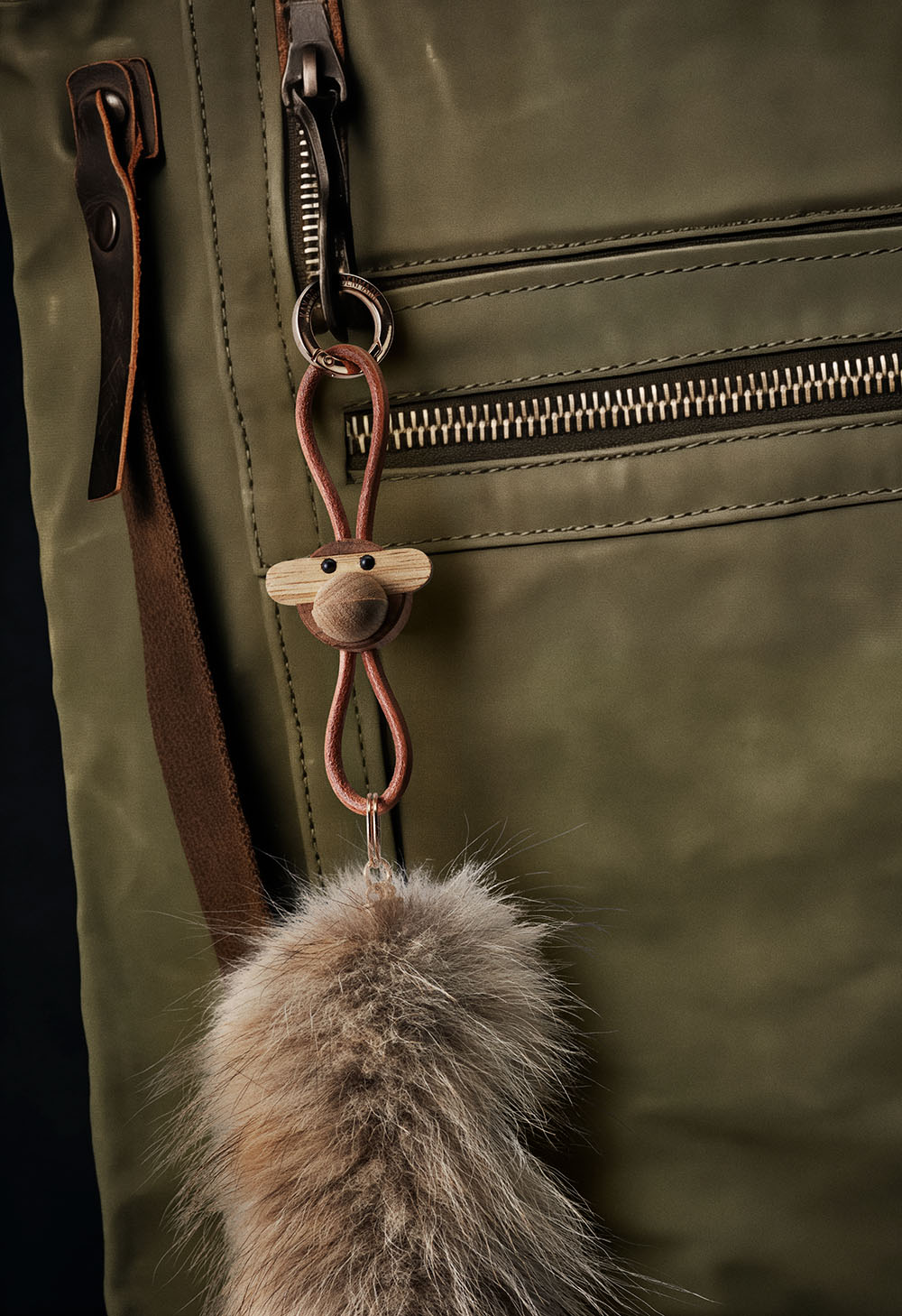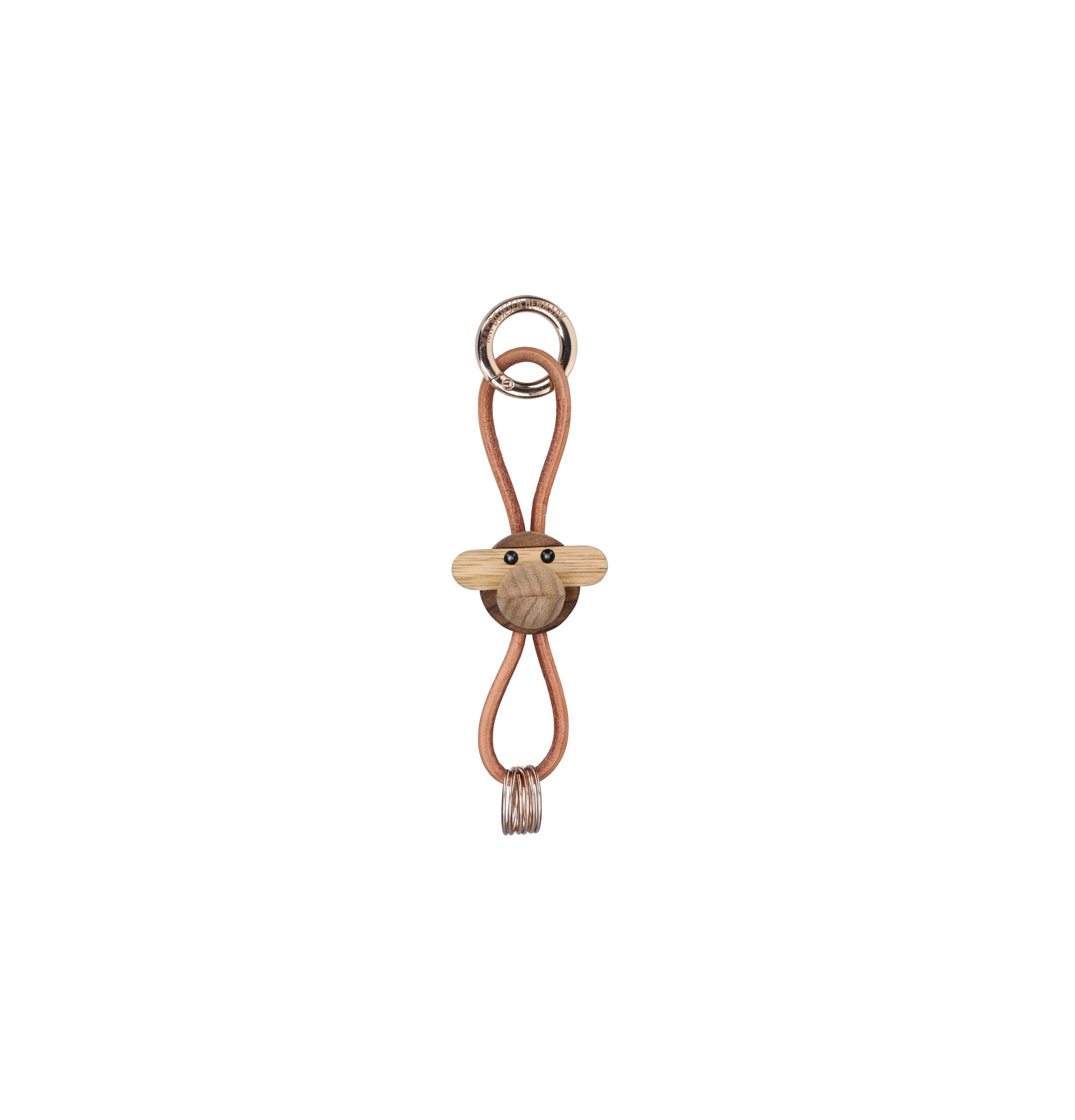 Stijlvolle nieuwe sleutelhanger met het bekende iconische apen-kopje van Kaj Bohesen. Dubbele lichtbruine lus met 1 dikke ring en drie kleine. Totale lengte koord is ongeveer 12,5 cm. Ook verkrijgbaar met chrome kleurige ring en zwarte veter