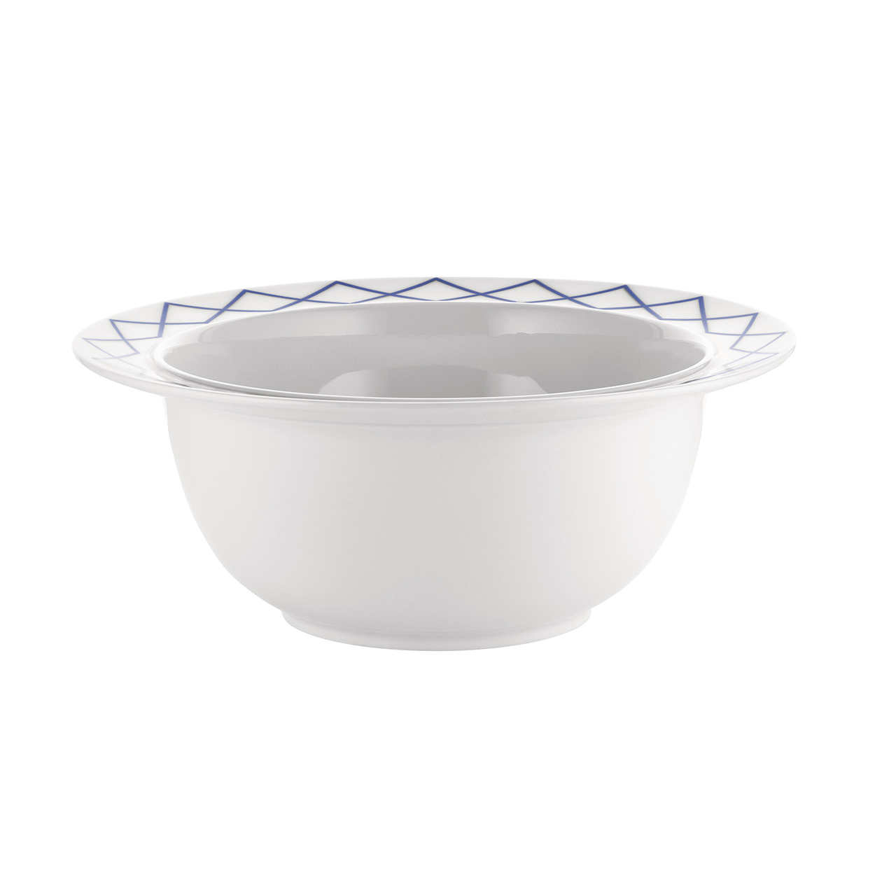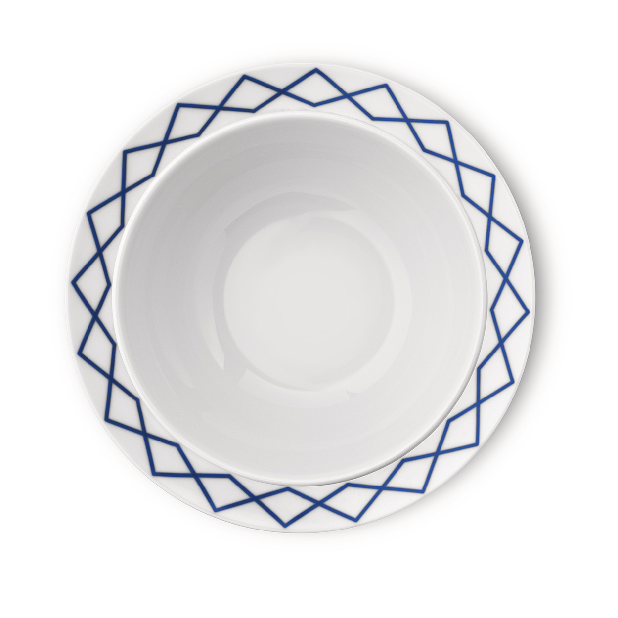 Heruitgave van het beroemde tafelservies van Ettore Sottsass uit 1993. Opvallend door het dunne witte porselein, de brede manchet en de subtiele randen. Deze serie heeft een bijzondere geometrische decoratie. Tijdens de eerste productie in 1993 bleek dat de blauwe decoratie tweemaal gebakken werd. Daarbij ontstond een andere kleur en scherpte, die de ontwerper juist enorm aansprak, waarop hij besloot dit te handhaven. Het servies laat zich ook goed combineren met delen uit de volledig witte serie. Vele liefhebbers dien de oude serie bezitten zullen nu de collectie weer aan kunnen vullen.