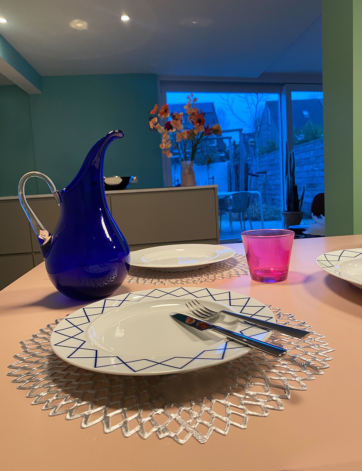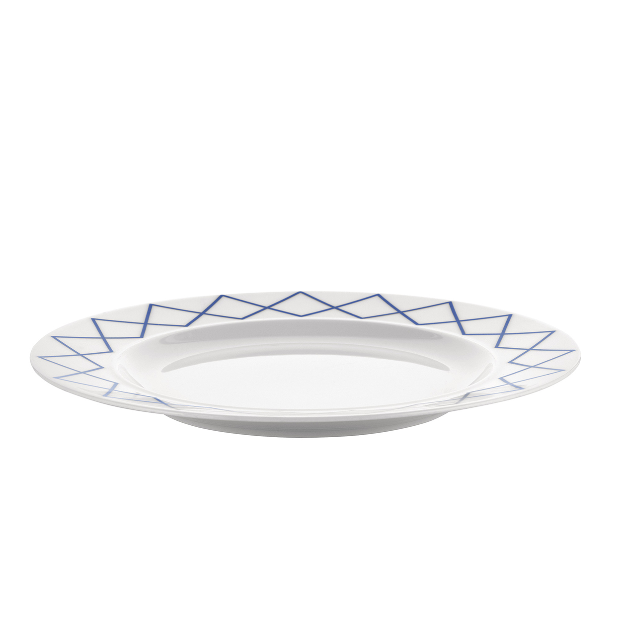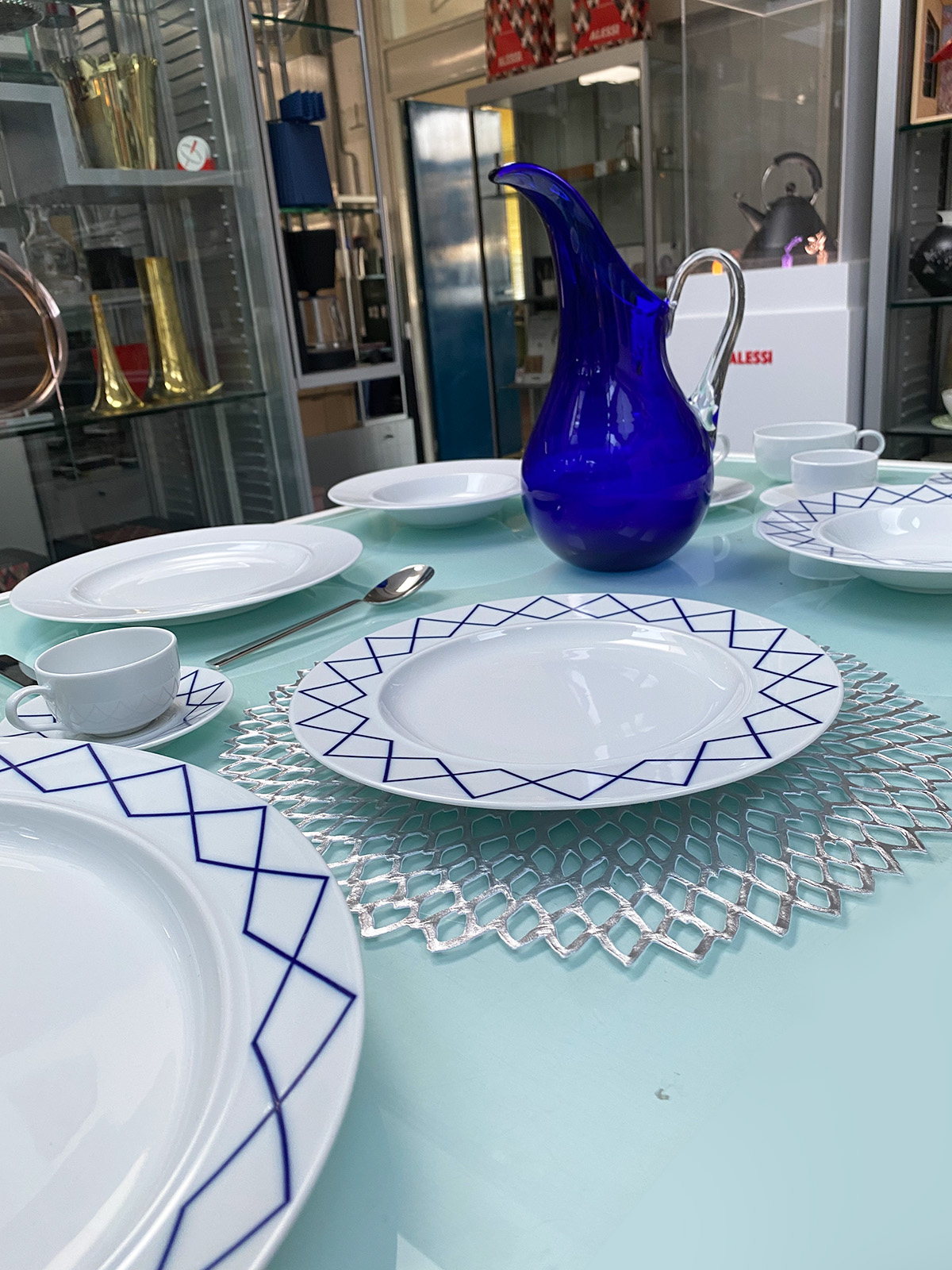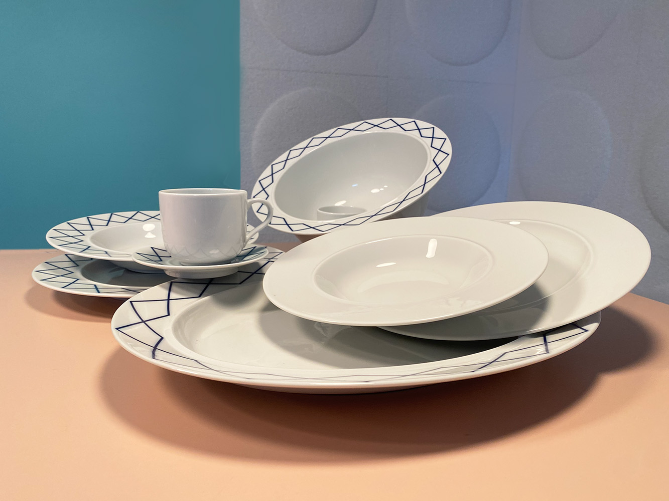Heruitgave van het beroemde tafelservies van Ettore Sottsass uit 1993. Opvallend door het dunne witte porselein, de brede manchet en de subtiele randen. Deze serie heeft een bijzondere geometrische decoratie. Tijdens de eerste productie in 1993 bleek dat de blauwe decoratie tweemaal gebakken werd. Daarbij ontstond een andere kleur en scherpte, die de ontwerper juist enorm aansprak, waarop hij besloot dit te handhaven. Het servies laat zich ook goed combineren met delen uit de volledig witte serie. Vele liefhebbers dien de oude serie bezitten zullen nu de collectie weer aan kunnen vullen.