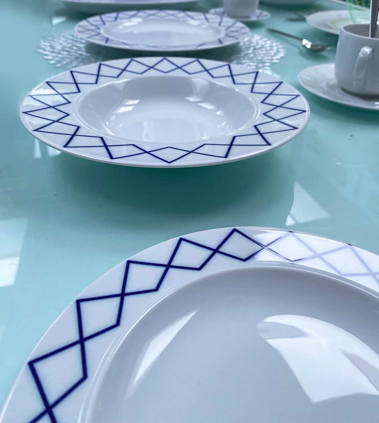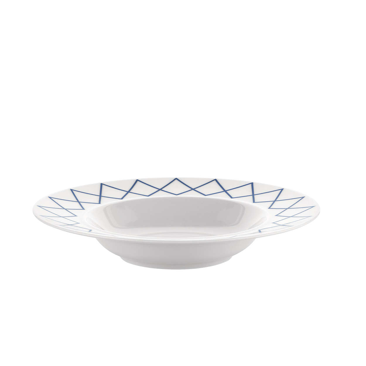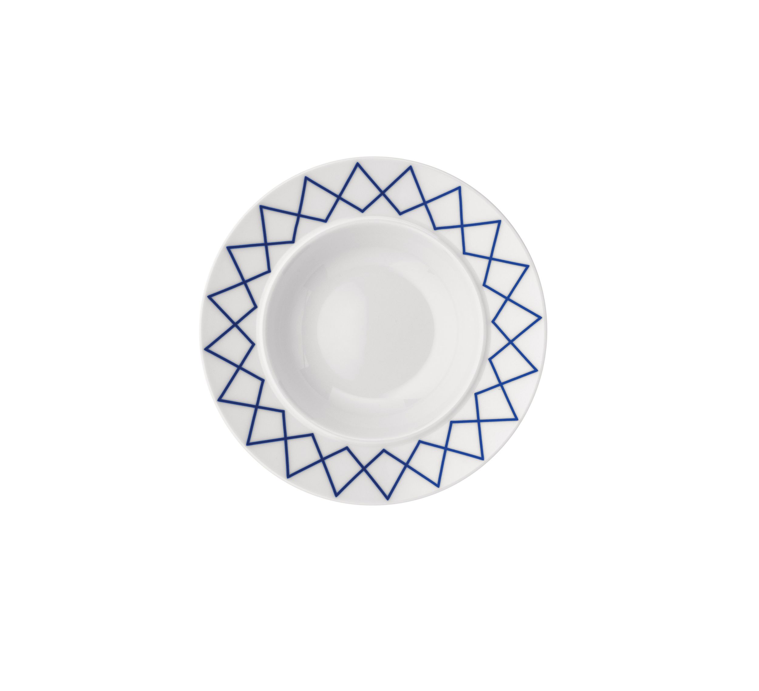 Heruitgave van het beroemde tafelservies van Ettore Sottsass uit 1993. Opvallend door het dunne witte porselein, de brede manchet en de subtiele randen. Deze serie heeft een bijzondere geometrische decoratie. Tijdens de eerste productie in 1993 bleek dat de blauwe decoratie tweemaal gebakken werd. Daarbij ontstond een andere kleur en scherpte, die de ontwerper juist enorm aansprak, waarop hij besloot dit te handhaven. Het servies laat zich ook goed combineren met delen uit de volledig witte serie. Vele liefhebbers dien de oude serie bezitten zullen nu de collectie weer aan kunnen vullen.