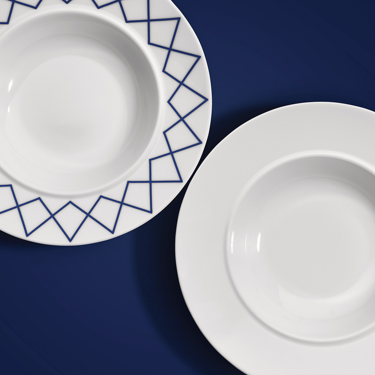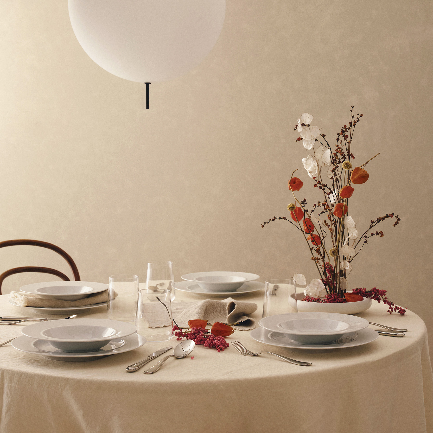 Heruitgave van het beroemde tafelservies van Ettore Sottsass uit 1993. Opvallend door het dunne witte porselein, de brede manchet en de subtiele randen.
